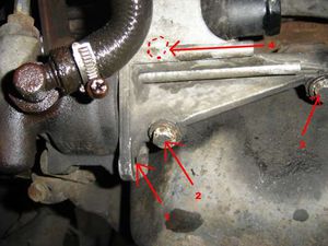 Der nächste Schritt ist die sehr lange Schraube im Drehpunkt der Servopumpenhalterung zu lösen. Dies geschieht von oben. Erst Mutter 1 in Bild 6 dargestellt lösen, und dann Das stehen bleibende Gewinde so weit wie möglich vorsichtig in Richtung Schraube 2 klopfen. Wenn das Gewinde auf der einen Seite verschwunden ist, am besten mit einem Schraubenschlüssel der eine kleinere Schlüsselweite hat, als der Schraubenkopf hinter den Kopf einfädeln, und mit einem Hammer vorsichtig aus der Bohrung klopfen.