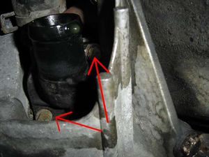 Nun muss man die gleiche Schraube (Schraube 4 in Bild 4 nicht sichtbar), genau über Schraube 1 angeordnet, noch einmal entfernen. Diese Schraube ist allerdings etwas schwer zu finden. Sie liegt unter dem schwarzen Flansch, die Achse der Schraube ist parallel zur Achse des Flansches, also über den Alu-Halter der Servopumpe. Um diese zu öffnen muss man mit einer Nuss auf einer Verlängerung zwischen Halterung und Flansch den besagten Schraubenkopf einfädeln. Dies ist noch einmal in Bild 5 dargestellt, hier in Verlängerung des Pfeils sitzt der Schrauben: