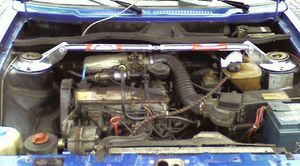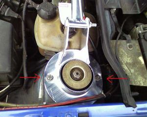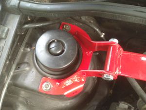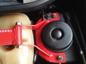 Jedoch wichtiger als jede Domstrebe ist die Querlenkerstrebe beim Cabrio, diese sollte grundsätzlich wenn nicht vorhanden, eingebaut werden. Im Folgenden wird der Einbau einer Domstrebe der Firma INXX erläutert. Speziell beim Golf 1 Cabrio ist es nötig, den Kühlwasserausgleichsbehälter und den Halter tiefer zu setzen.