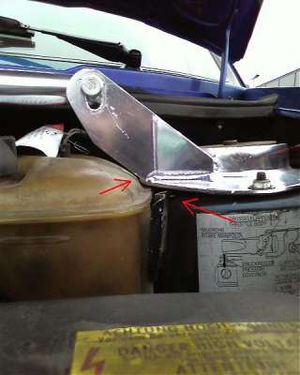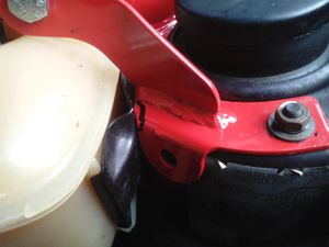 Am Ausgleichsbehälter könnte man von der Strebe die markierte Stelle abflexen, aber mit etwas Kraft kann man die Halterung um die fehlenden 2mm vom Dom wegdrücken.