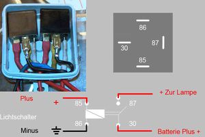 Man schneidet sich nun Kabel zurecht und versieht die Enden zu den Relais mit Kabelschuhen, ich habe sie verlötet und keine Quetschverbinder genommen. An das andere Ende kommt der Stecker bzw. die Buchse. Wie oben schon erwähnt bekam die Zuleitung die Buchse und der H4-Stecker an der Lampe den Stecker, also muss jetzt die Zuleitung zum Relais ein Steckerteil bekommen und vom Relais weg muss die Buchseverbaut werden. Für die Masse (Minus vom Lichtschalter) bauen wir eine Brücke vom Relais für das Ablendlicht, zum Relais für das Fernlicht - oder fertigen ein Y-Kabel an (weil ja vom Lichtschalter nur ein Massekabel kommt). Die Plus Kabel die von der Batterie kommen, müssen direkt an der Batterie mit Flachsicherungshaltern abgesichert werden (ich benutze 20A).