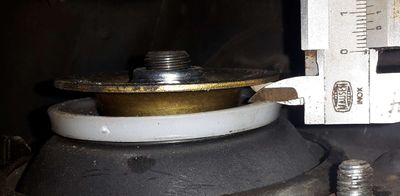 Mit einfachen Worten gesagt, vom Käfer Teil wird außen was weg geschnitten, vom Golf 1 Teil wird das innere weg genommen. Wenn man sich eine Kreischablone mit Durchmesser 110 mm anfertigt kann man bequem das Teil vom Käfer anreißen. Um an die Platte zu kommen muss ein vulkanisiertes Lager zerlegt werden, das kann etwas mühsam sein, Gummireste müssen entfernt werden: