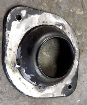 Dann wird der beschnittene Topf aus dem Käferdomlager in die entstandene Aussparung des Golf 1 Domlagers eingesetzt und später verschweißt. Am sinnvollsten ist es die Teile so anzuordnen als wenn man den Topf von unten nach oben (wie eingebaut) durch die Platte schieben will. Dafür braucht die Platte eine runde Öffnung von 95(+3) mm , eine Drehbank wäre von Vorteil für solche Arbeiten. Zum Heften wäre eine Vorrichtung gut, um die Teile so genau wie möglich auszurichten, bzw dass sie wirklich plan zusammenliegen. Der Schweißfachmann weiss wo er die Nähte zu setzen hat.