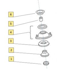Neu als Ersatzteil ist das Käfer Domlager derzeit nur unter der Nr. 8142400200 von JP-Group im Handel erhältlich. Einige Shops wie z.B. Hoffmann Speedster verkaufen das JP-Group Domlager auch unter eigenem Label, es ist aber exakt das gleiche. Bei dem JP-Group-Teil handelt es sich um einen "Domlagersatz", hier ist alles enthalten (Nr. (1) bis (5), d.h. inkl. passender Distanzhülse) bis auf den Anschlag (6). Diesen muss man sich dann separat besorgen