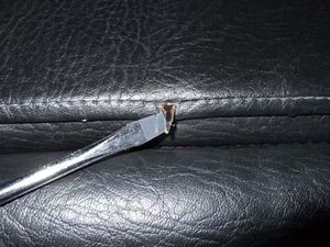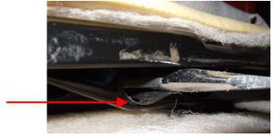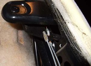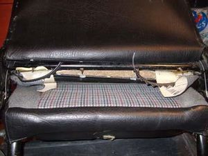 Sollte die Führungshülse nur wackeln, aber nicht herausgehen, dann muss man den Sitzbezug abmontieren – und zwar soweit, dass man die Hülse von innen herausdrücken kann. Dazu den ausgebauten Sitz nach vorne klappen und unten am Lehnenrahmen die 4 Blechlaschen mit einem Schraubenzieher vorsichtig aufbiegen, sodass man den Sitzbezug nicht beschädigt.