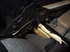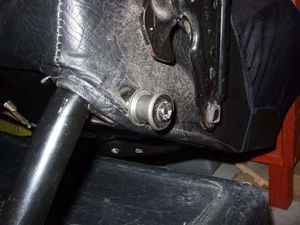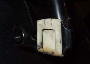 Wackelnde Sitze haben ihre Ursache meistens in den defekten oder gar nicht mehr vorhandenen Gleitstücken auf den Sitzstützen. Zuerst Sitz ausbauen. Sitz nach vorne schieben und vorne am Haltebock in der Sitzmitte die Schraube lösen. Dabei gleich achten, ob hier auch der Gummi noch vorhanden ist: