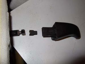 Spätestens jetzt muss der Knopf von Entriegelungshebel seitlich abgezogen werden. Der Knopf ist nur gesteckt, ohne Schrauben. Also vorsichtig ziehen. Achtet bitte auf die kleine Klammer (Bildmitte). Die hält den Knopf am Hebel. Nicht verlieren! Die Blende Nr. 165 881 607 01C ebenfalls entfernen, sie ist mit einem Kreuzschrauben im unteren Bereich 1x befestigt.