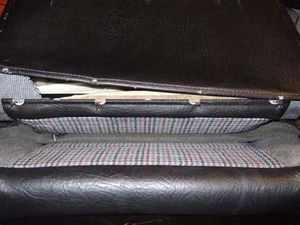 Jetzt lässt sich der Bezug bequem nach oben wegziehen. Die beiden Schaumgummistreifen sollten am Sitzgestell draufbleiben, sie schützen den Bezug. Notfalls ankleben.