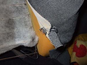 Um den Bezug weit nach oben schieben zu können, muss er auf der Vorderseite von seinen Befestigungsklammern befreit werden. Diese Klammern sind Spezialklammern. Sie sehen aus wie umgebogene Nägel und sind an beiden Enden scharfkantig. Beim Hantieren mit Schraubenzieher oder Zange besteht wieder einmal allerhöchste Verletzungsgefahr (scharfe Kante, Abrutschen mit dem Werkzeug). Es gibt sogar eigene Zangen um diese Klammern wieder zusammenzubiegen.