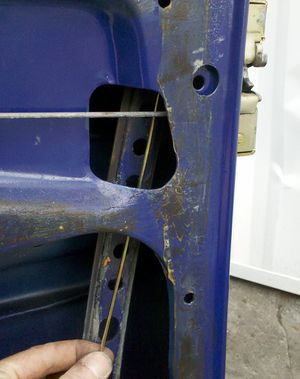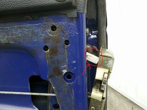 Dann ging es weiter mit dem Gestänge, Ich habe die beiden Plastikklippse vom Golf 2 (siehe Materialliste) benutzt. Es gibt einen schwarzen und ein weißen Klipp. Der weiße ist für die Fahrer- und der schwarze für die Beifahrertür. Dazu muss man den Schlosskasten an der Tür lösen und ein Stück von der Tür wegziehen: