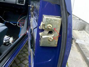 Dann müsst ihr den alten Klipp bzw. Hebel in Richtung A-Säule von Schlosskasten abziehen und danach das ganze Richtung B-Säule aus der Tür nehmen. Natürlich müsst ihr vorher den Türpin abschrauben: