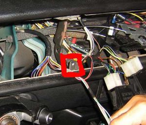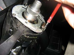 Die Knieschutzverkleidung (Hartfaserpappe) ist an einen Stahlträger geklipst, die Pappe bleibt aber am Stahlträger und wird mit diesem komplett herausgenommen. Der Knieschutz ist mit jeweils vier Schrauben links und rechts befestigt, diese löst man mit der Rätsche, einer 13mm Nuss und einer kurzen, bzw. langen Verlängerung. Dazu legt man sich am besten auf dem Rücken in den Fußraum um an die Schrauben zu gelangen. Nach Entfernen der Schrauben kann der Knieschutz komplett entfernt werden. Wenn das Lenkrad noch eingebaut sein sollte, aufpassen, da der Stahlträger des Knieschutzes scharfe Kanten hat und ein Leder- oder Holzlenkrad zerkratzen kann. Schritt 3. Lenkrad und Blink/Scheibenwischerhebel Als erstes wird das Lenkrad in Mittelstellung gebracht, dann die Abdeckung in der Mitte abgenommen. Kabel abziehen und den „Hupenschalter“ herausnehmen. Rätsche mit Verlängerung und 24mm Nuss ansetzen, das Lenkrad mit den Knien Festklemmen oder Lenkradschloss einrasten lassen, die Mutter lösen und rausschrauben. Danach kann das Lenkrad einfach abgezogen werden.