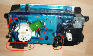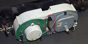 Eigentlich ist dies kein Stecker, aber doch eben ein Anschluss am Kombiinstrument: Hier wird über einen dünnen Gummischlauch der Unterdruck aus der Ansaugbrücke an den Unterdruckgeber (die kleine grüne oder schwarze Box) weiter gereicht und dient der Berechnung des Spritverbrauchs. Nur bei Tachos mit MFA vorhanden.