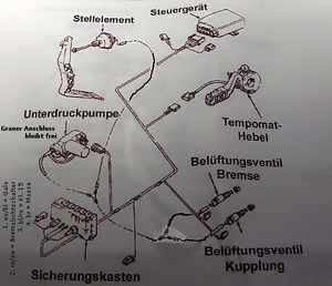 Der GRA-Kabelbaum ist übigens sehr einfach anzuschließen. Neben den GRA-eigenen Komponenten (Unterdruckpumpe, Lenkstockhebel, Pedalkontakte, GRA-Steuergerät) muss man lediglich vier Leitungen anschließen: