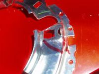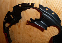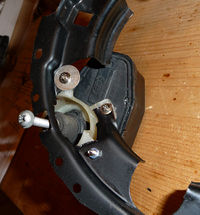 Es bleibt ein "Arm" (der mittlere) der Leuchtweitenregulierung frei, in die keine Schraube kommt. Für diesen Arm biegt ihr das Blech hoch (siehe Bild) damit der Arm dort aufliegen kann. Jetzt sollte bei auch die Leuchtweitenregulierung stabil und richtig sitzten damit der Scheinwerfer wieder eingeschraubt werden kann.