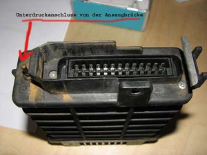 Zur Vervollständigung dieser Anleitung hier noch die Pin-Belegung des PG-Steuergerätes (Teilenummer 037 906 022 DM) (Pfeil = Unterdruckanschluss Ansaugbrücke):