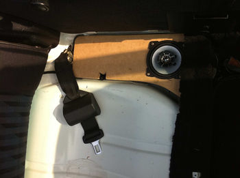 Ich habe mich also auf die Suche nach einem unsichtbaren einbauplatz gemacht und bin dabei auf einen großen ungenutzten Hohlraum links und rechts unterhalb der Rücksitzbank gestoßen. Dieser ist nach vorne Richtung Fußraum und hinten am Gurtaufroller offen, der Schall sollte also ausreichend durchkommen.