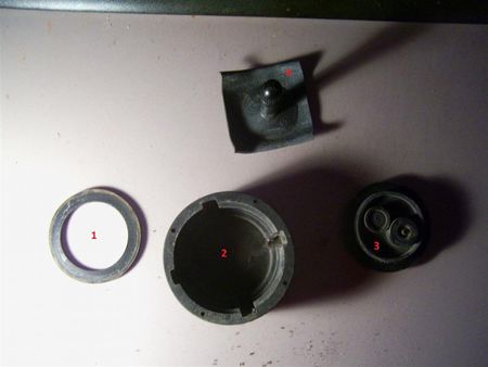 Habt Ihr den Deckel (2) mit der Öffnung nach oben zeigend vor euch liegen (siehe Bild), nehmt Ihr einfach die Gummidichtung (1) am Rand heraus. Die Mechanik (3), die das Kühlsystem vor Über- und Unterdruck schützt lässt sich dann entnehmen.